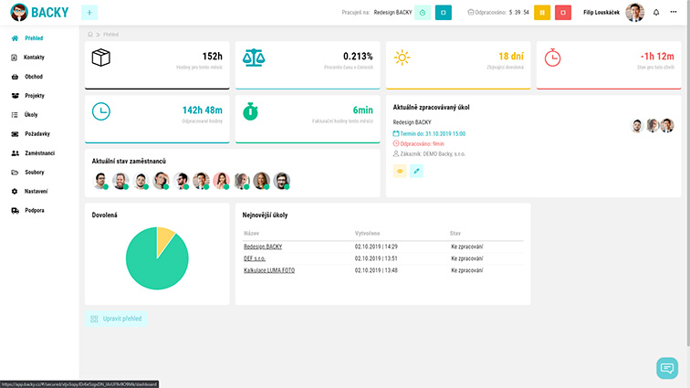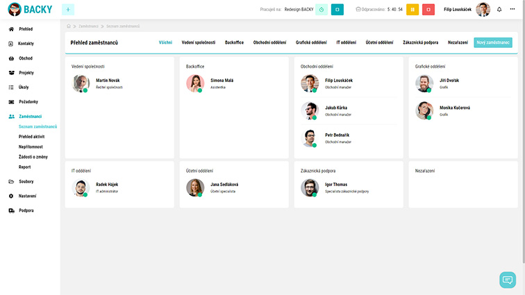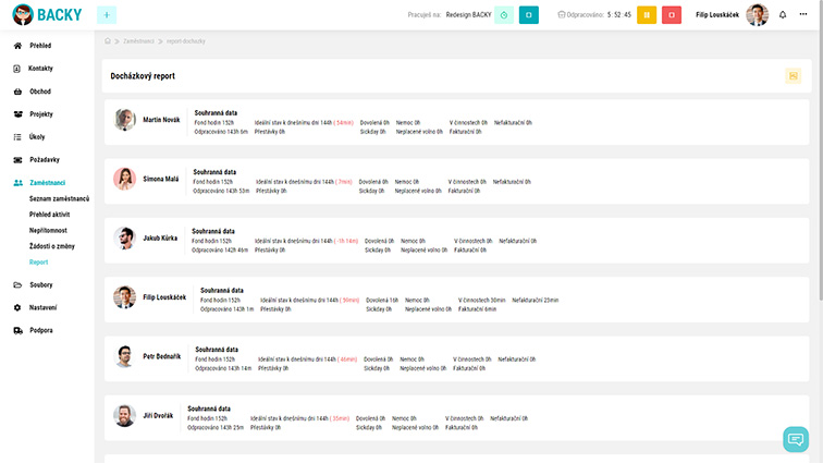 Díky Backy budete mít o Vašich zaměstnancích jasný a zároveň jednoduchý přehled. Od profilu jednotlivců, hromadných přehledů až po statistiky všech pracovních úkolů, projektů nebo obchodních případů.